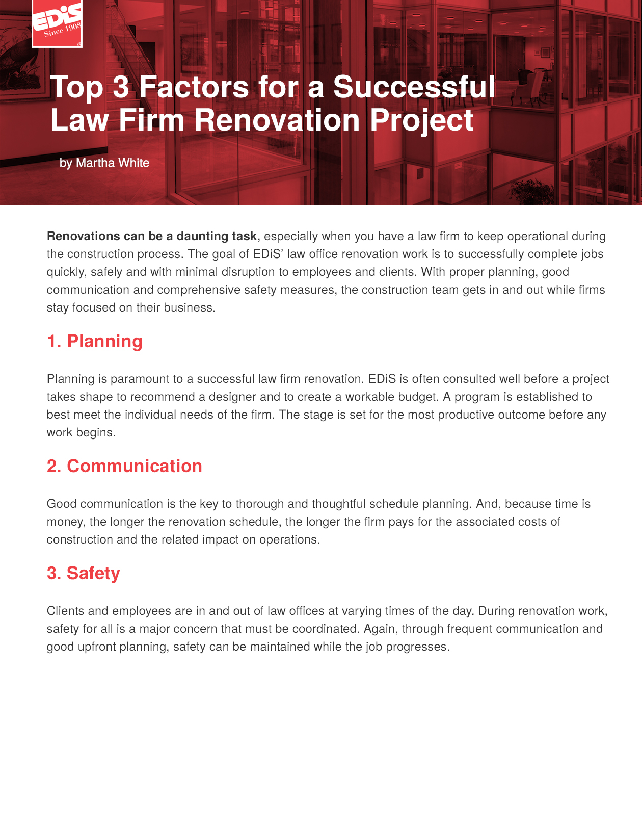 “Thank you for your interest in the experience and capability of EdiS Company. We look forward to helping you get back to doing what it is you do best with knowledge for the job site and information about construction services that are crucial to achieving your building goals.”